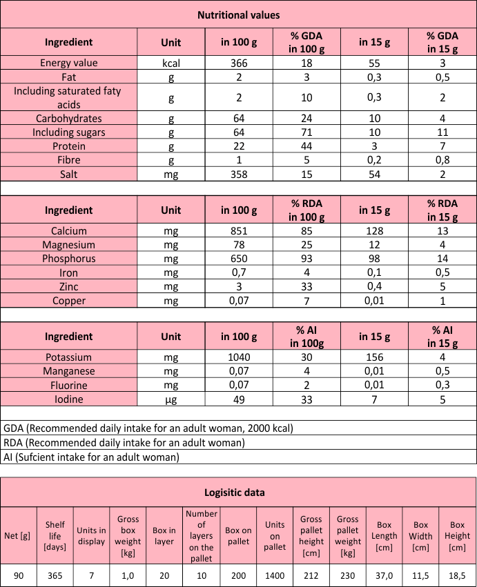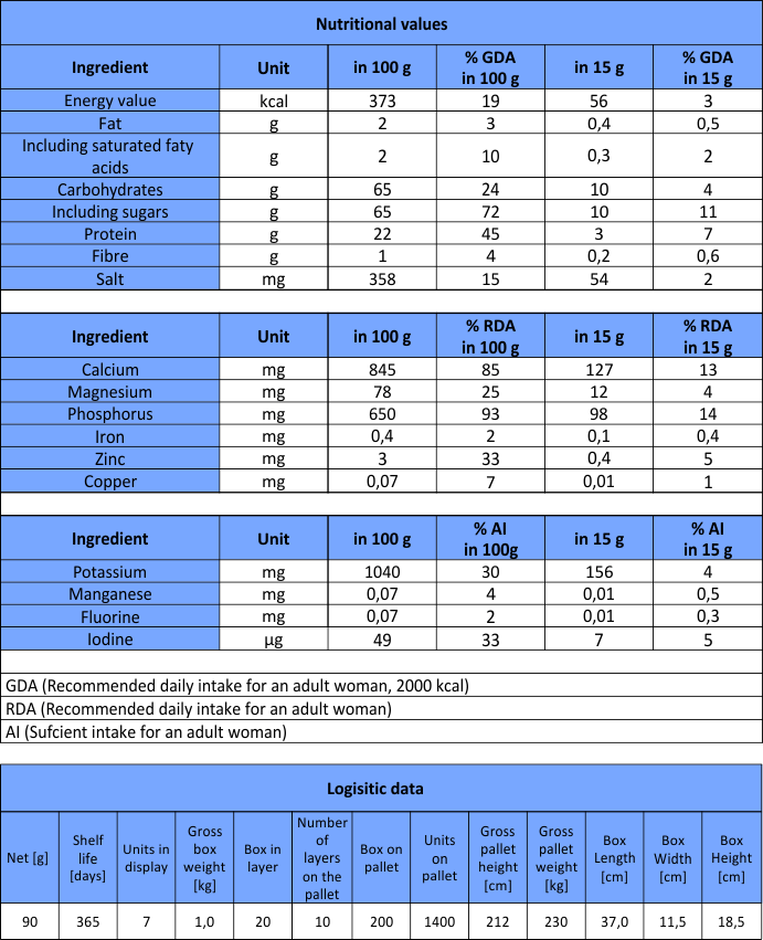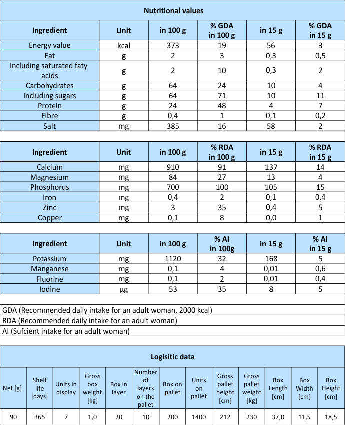 Skimmed milk powder 65%, sugar,